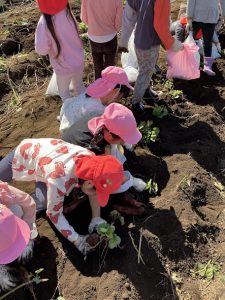 姉妹園の西原ほほえみ保育園4・5歳児と一緒に笹幡保育園の4・5歳児とバスに乗って白石農園まで芋ほり遠足に行きました。合同での遠足が初めてお互いドキドキ・わくわくしながら、楽しい遠足になりました。