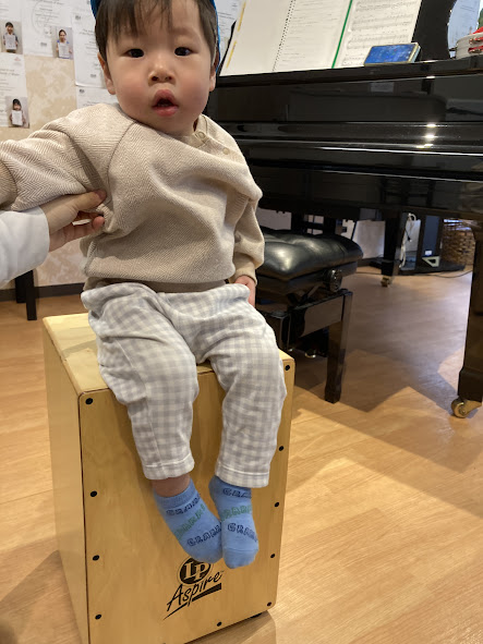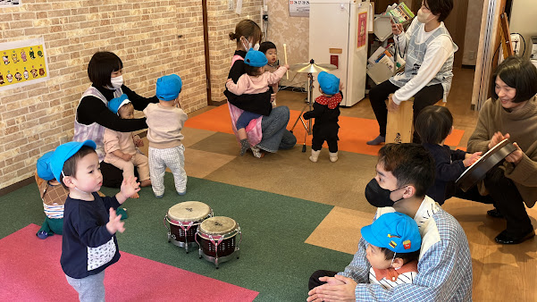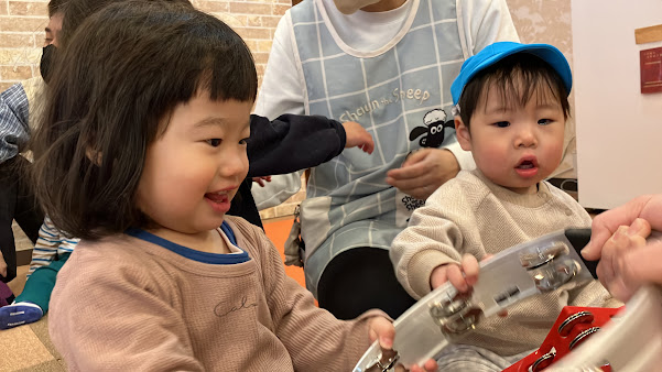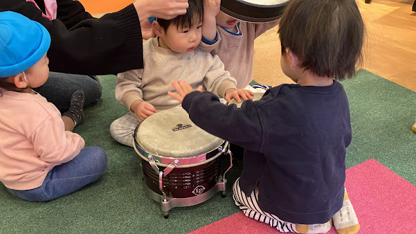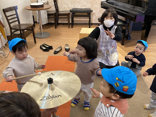 4回目になると講師の先生の声でみんな座りはじめ、あいさつでタンバリンを使うことも覚えていた子ども達。”トライアングル” ”ウインドチャイム” ”ボンゴ” ”シンバル” ”カフォン” ”フレームドラム”など様々な打楽器の説明を聞き、直接触れて音を鳴らしました。それぞれ気に入った楽器が見つかり、最後はエレクトーンと合わせて1曲セッション♪楽しいひと時を過ごしています。